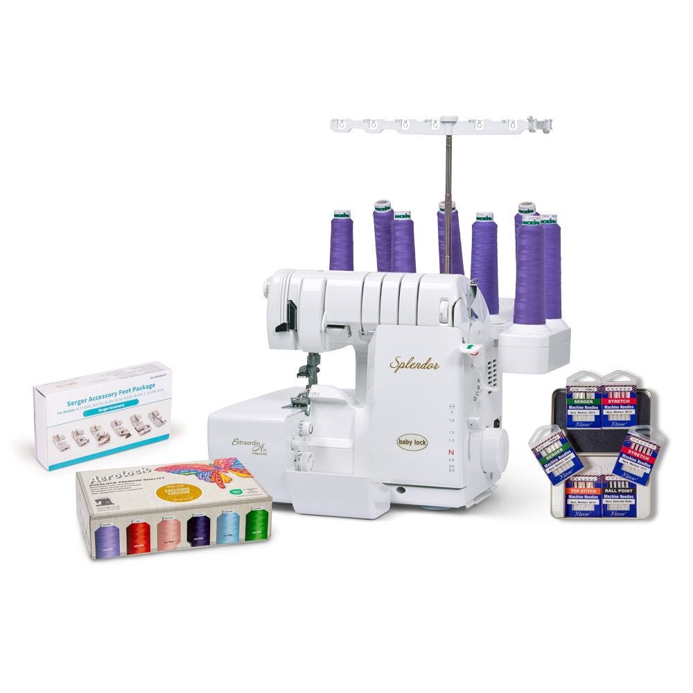 Splendor Machine and Launch Bundle includes: BLSP8 Splendor Serger; BLE8W-FEET, Foot Package 6pc; 9118-BL, BL Exclusive Madeira Aerolock Mini King Thread Set- 24 cones 6 colors, 1320yd cones; AK6194-EL705, Needles Klasse Serger 6pc Variety Tin