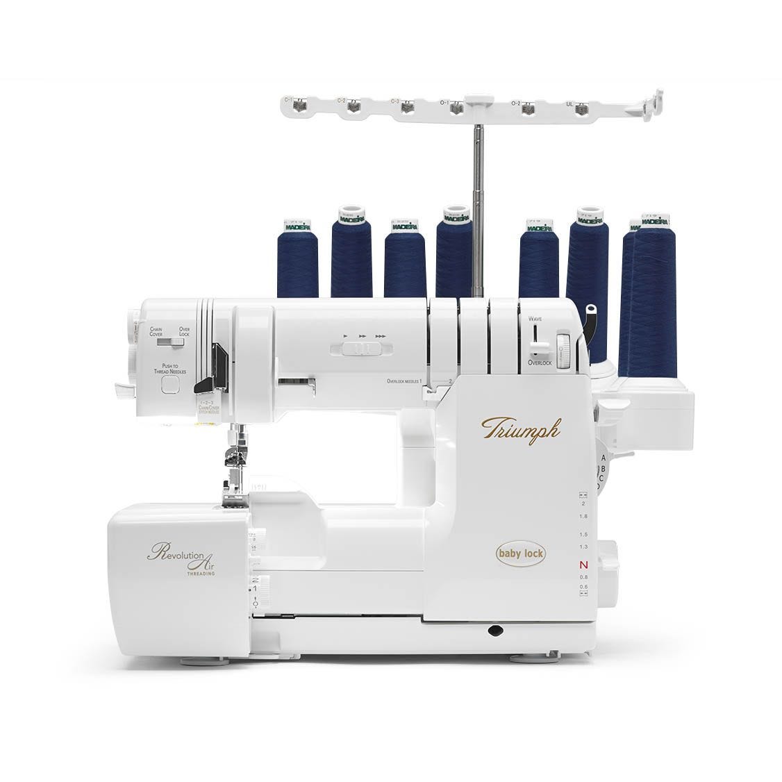 Baby Lock Triumph Serger – The Baby Lock Triumph serger conquers serging in a way you never thought possible thanks to RevolutionAir threading. Thread the loopers with just the touch of a button and then thread the needles automatically with the touch of another button. You`ll have more time to focus on your creativity than worrying about setting up your machine. The Triumph also has all the features you`ve come to expect from Baby Lock Sergers that make all your creative dreams a reality. The Baby Lock Triumph serger`s top features include: Easy push button needle and looper threading. 5 of machine space to the right of the needle. 8/7/6 thread serging – 87 stitch combinations including the exclusive Wave Stitch. 6 bright LED lights. Variable speed control. Knee lift. Full featured differential feed. No Longer Includes Mounting bolt.